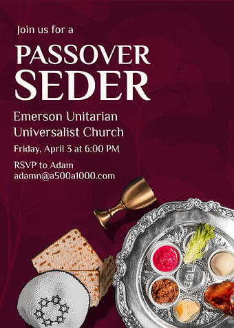 – Friday, April 3, @ 6 pm: Passover Seder. Contact Adam.