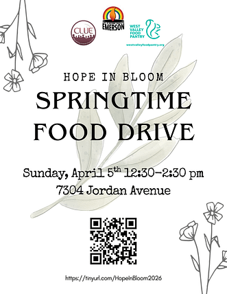 On Easter at Emerson, April 5 from 12:30 – 2:30 pm: Hope in Bloom Food & Supply Drive. See our list of needed items at tinyurl.com/hopeinbloom2026. Contact outreach@emersonuuc.org for more information or to volunteer.