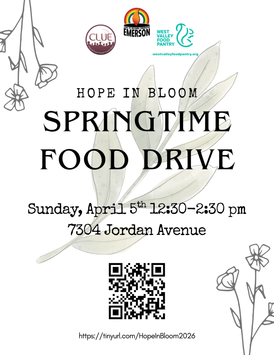 On Easter at Emerson, April 5 from 12:30 – 2:30 pm: Hope in Bloom Food & Supply Drive. See our list of needed items at tinyurl.com/hopeinbloom2026. Contact outreach@emersonuuc.org for more information or to volunteer.